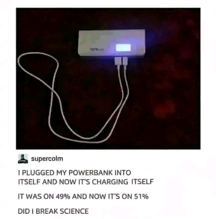 The Powerbank Paradox: Can a Device Charge Itself? The image and caption present a humorous, yet thought-provoking scenario: a powerbank is shown plugged into itself, with the claim that it began to charge itself, raising its battery level from 49% to 51%. The post humorously asks, “Did I break science?” While the post is clearlyContinue reading "The Powerbank Paradox: Can a Device Charge Itself?"